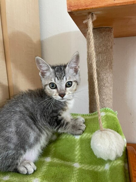 | 特徴(性格など) | 6匹兄妹で保護されました。1匹は力及ばずでしたが、5匹は元気に育っています。 こえだちゃんはおとなしくて穏やかな性格です。皆、よく食べよく寝て、よく育っています。 キジトラの、こえだちゃんに、ぜひ会いに来てください(^^) ・ノミダニ回虫駆除済み ・エイズ(-)、白血病(-) ・3種混合ワクチン接種済 |