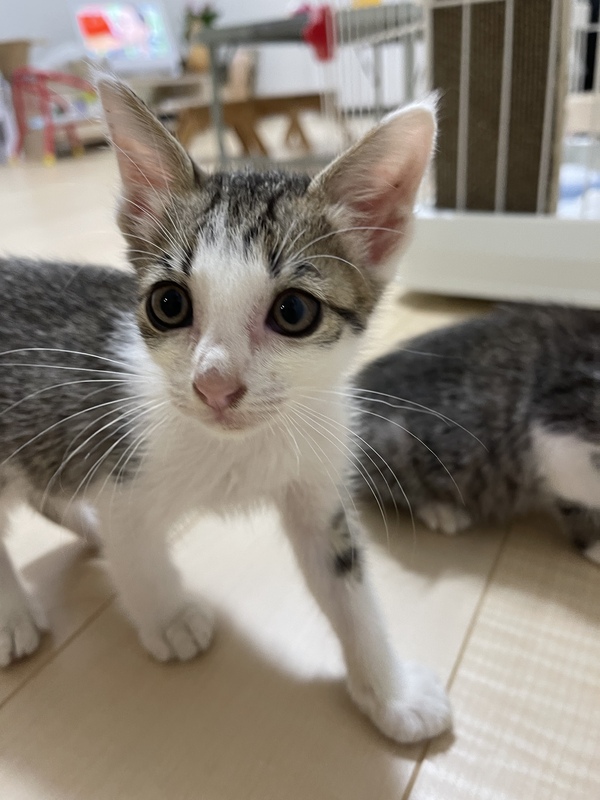 | 里親募集する理由 | ある場所の車の下で泣いていました そこには良く野良猫がいるので気にして いなかったのですが2匹はガリガリで 小さい子猫でした。家族と相談し保護する 事に。元トリマーの母に洗ってもらうと ノミ本体もノミフンもなく肌も綺麗な状態 だったので前までは誰かに飼われていた んだと思います。家では飼うことは出来ないので里親募集をしています。 自分のワガママなのですが兄弟仲良く遊ぶ ので2匹一緒に保護できる人は2匹一緒に保護 してくれるとありがたいです。 もちろん1匹だけでもいいです。 2匹一緒に飼ってくれる方にはトイレと 2段ケージを譲ります。 |
