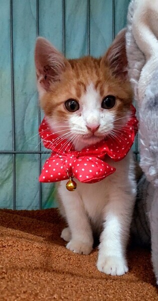 | 特徴(性格など) | 保護された当初は怖かったのか、シャーシャー威嚇していましたが、今はゴロゴロ、スリスリしてくる甘えたさんになりました♪ 性格も穏やかな子でおとなしく、抱っこもさせてくれます。食欲も旺盛で元気に育っています。 写真からも分かると思いますが、破壊力抜群のかわいさです(^^) ・ノミダニ回虫駆除済み ・エイズ(−)白血病(−) ・3種混合ワクチン接種済み |
