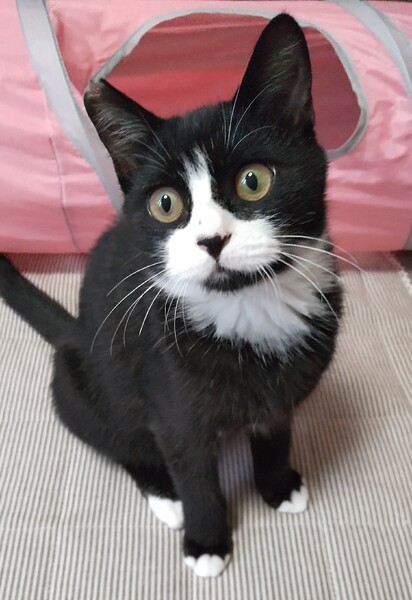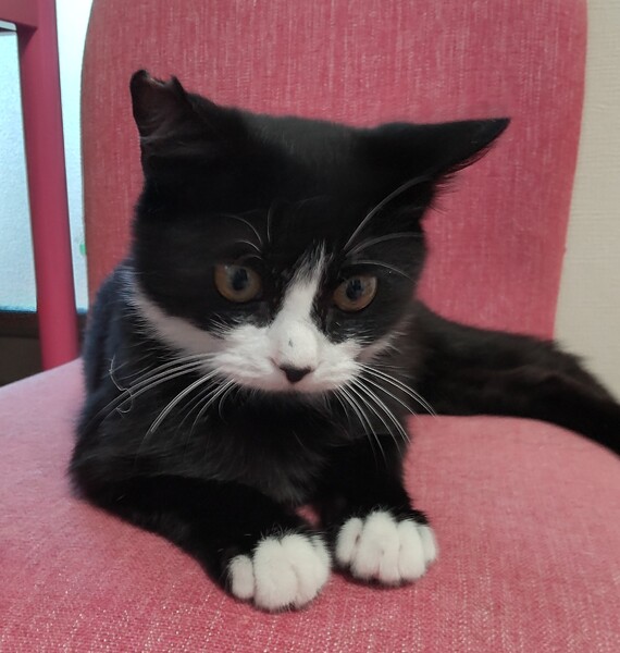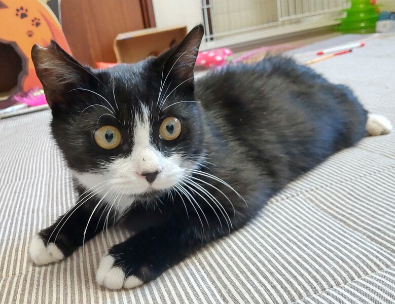 | 特徴(性格など) | 撫でられるのもお膝の上も大好きな甘えん坊さん。 人の姿が見えると構って欲しくてニャーニャー呼びます。 ちょっとフワフワした毛並みでコロンとしてます。顎の下にも黒い模様で靴下履いたオシャレさん。 スリスリゴロゴロの可愛い子です。 |