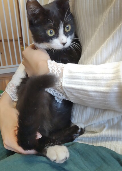 | 里親募集する理由 | 住宅地の一角で母猫と2匹でご飯をもらっていました。 ご飯が足りないのかとてもお腹を空かせていました。 母猫は不妊手術後に元の場所に戻し、餌やりさんにお世話をお願いしました。 まだ子猫の白黒くんは保護しました。 |