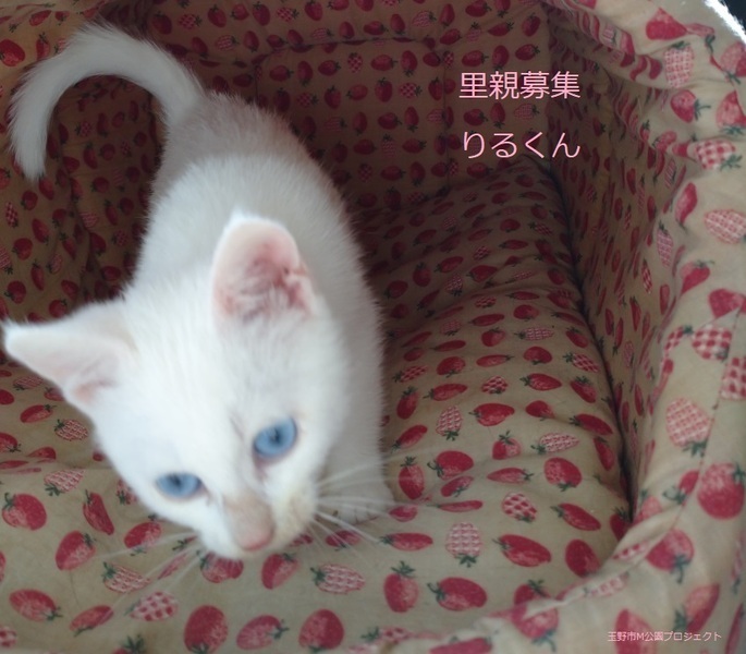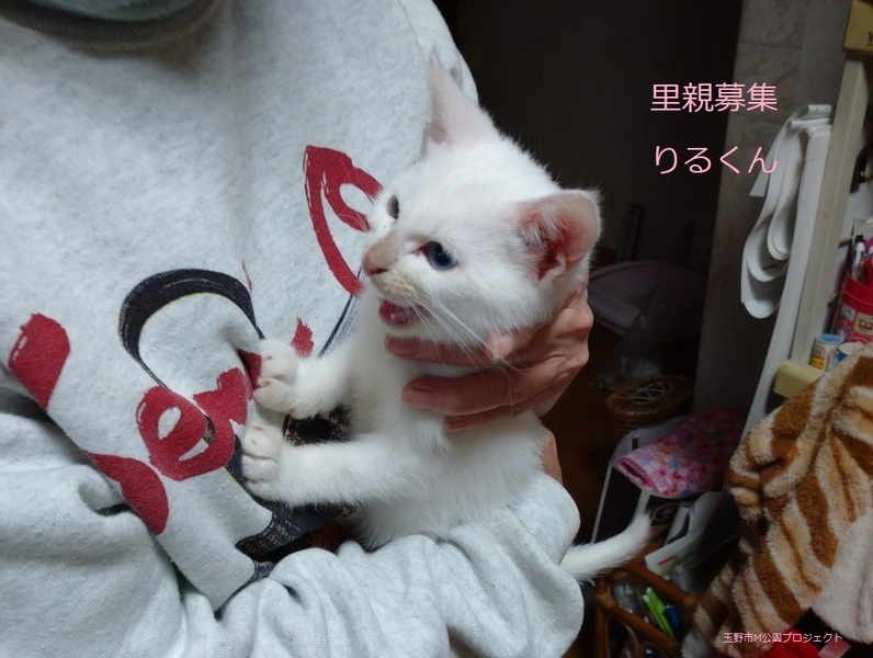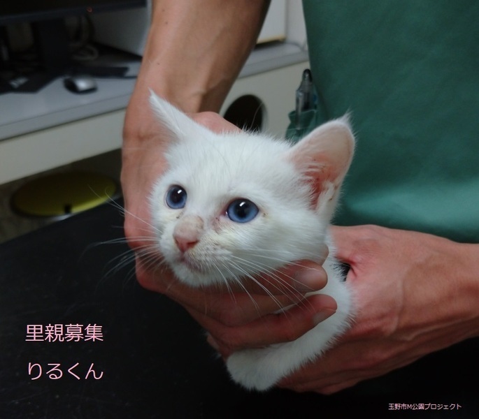 | 特徴(性格など) | 白子猫、男の子、仮名:りるくん 推定生後2か月くらい、体重:900g 10/29日 検便 直接法、浮遊法 問題なし 9/29日 ウイルス検査 エイズ、白血病共に陰性 10/29日 三種混合ワクチン接種 10/29日 ブロードライン滴下 11/4日 元気にすくすくと、大きくなりました。 甘えん坊で、抱っこ大好きな可愛い子です。 12/3、三種混合ワクチン追加接種済み。 2022年4/22、去勢手術済み。 |