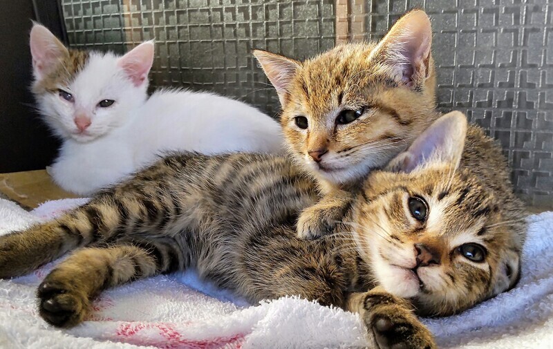 | 特徴(性格など) | 白がメイン1匹、キジ虎2匹、全員オスです。白い子が一番元気でやんちゃです。小さいキジ虎は体が一番小さいけれど、ご飯の時は誰にも負けません、元気いっぱいです。少し大きめのキジ虎はおとなしく、優しい性格で甘えん坊です。 | ||