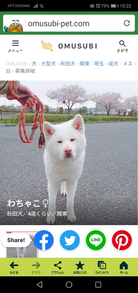 | 特徴(性格など) | 白い秋田犬 甘えん坊で元気一杯 お散歩大好きです 他の犬は駄目なので一頭飼育でお願いします |