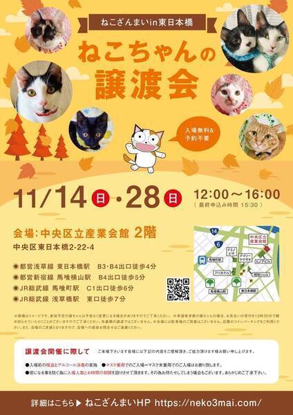 | その他(譲渡条件など) | 【新型コロナウィルス感染予防対策について】 譲渡会開催に際し、ご来場下さいます皆様には以下の内容をご理解頂き、ご協力頂けます様お願い申し上げます。 ●入場前の検温とアルコール消毒の実施 ●マスク着用でのご入場=マスク未着用でのご入場はお断り致します ●入場人数の制限をさせていただきます ●時間と人数の制限=密になる事を防ぐ為に入場人数とお時間の制限を設けさせて頂きます その為お待たせしてしまう場合もございます ●会場利用規約により、ご来場者様の連絡先を控えさせていただきます あらかじめご了承下さい 里親様決定は14時以降となります。 その後、迎え入れ準備の説明等のお時間も頂戴しますので、お時間に余裕を持ってご来場下さい。 諸々の制限がございますが、安心・安全な譲渡会運営のためにご理解・ご協力いただきますようお願い申し上げます。 ~~~~~~~~~~~~~~~~~~~~~~~~~~~~~~ ★仔猫ご希望の里親様★ 仔猫ちゃんたちは、まだ体がしっかりしていない赤ちゃんです。 下痢だけでも数時間対応ができなかっただけ死に至る事もあります。 その為、月齢に応じたお留守番時間を設けさせていただいております。 また、子猫ちゃん(6ヶ月未満)の里親様には子猫支援金のご協力をお願い致しております。 ★猫ちゃんとのお見合いは譲渡会で!★ ねこざんまいの猫ちゃんは譲渡会でのお見合いのみとなります。 『この子はいつ譲渡会に参加するの?』『譲渡会場の場所はどこ?』など はねこざんまいホームページをご覧ください。 https://neko3mai.com/ ★楽しく猫ちゃんと触れ合って★ ねこざんまい譲渡会は、猫ちゃんも里親様も保護主も笑顔で過ごせる譲渡会を目指しています。 これから20年以上、楽しい時も、悲しい時もいつも傍にいてくれる大切な家族になる猫ちゃんです。 会場には沢山の猫ちゃんがいます。 1匹1匹、触れ合って猫ちゃんとお話ししてください。 『初めて猫ちゃんを家族に迎える方』 『先住猫ちゃんのお友達を迎える方』など トライアルの仕方や先住猫ちゃんと仲良くなるコツなど経験豊富な保護主やスタッフにお気軽にご相談ください! 猫を愛し、そして猫に愛されている猫好きスタッフと保護主がアドバイスさせていただきます。 ★里親希望のみなさまへ★ ペットではなく、家族一員としてたっぷり愛情を注いでくださるご家庭をお待ちしております。 恐れ入りますが、 ・学生の方 ・一人暮らし、同棲中の方 ・子猫、若猫希望の60歳以上のみのご家庭 ・脱走防止対策にご協力いただけない方 は原則譲渡を遠慮させていただいております。 ただし、預かりボランティアさんとして新しい家族が決まるまでの間、猫ちゃんを預かっていただく道もございます。 参加猫ちゃんは、それぞれ保護主(実際に猫ちゃんを自宅に入れ、保護をしている方)が異なります。 詳しい条件なども異なる場合がございますので、会場内で直接保護主とお話ください。 〖共通条件〗 1.終生飼育 2.完全室内飼い 3.脱走防止対策へのご協力 4.避妊去勢手術 5.契約書類へのサイン 6.定期報告 7.医療費等の負担 当日の猫ちゃんを連れて帰ることはできません。後日、保護主が里親様のご自宅までお届け致します。 その為、移動の際の猫ちゃんの負担を月齢などから考慮し、お届け地区を限定させて頂くこともございますのでご了承ください。 ご理解とご協力のほど宜しくお願い致します。 ☆よくある質問☆ ・譲渡の条件 ・ご負担頂く費用 ・譲渡会の場所等は ホームページに詳しく掲載させて頂いておりますのでご覧ください。 https://neko3mai.com/ メールでのお問い合わせはすぐにご返答出来ない場合がございますのでご了承ください。 ホームページ https://neko3mai.com/ お問い合わせ http://www.neko3mai.com/contact/form_general.html ねこざんまいブログ http://ameblo.jp/neko3mai/ |