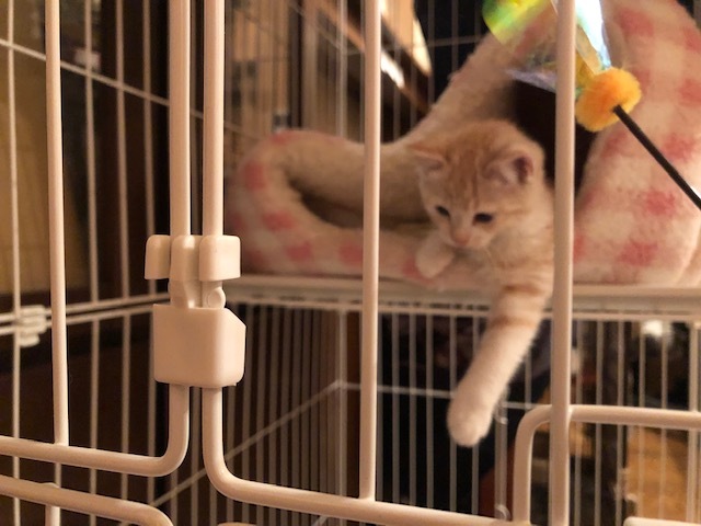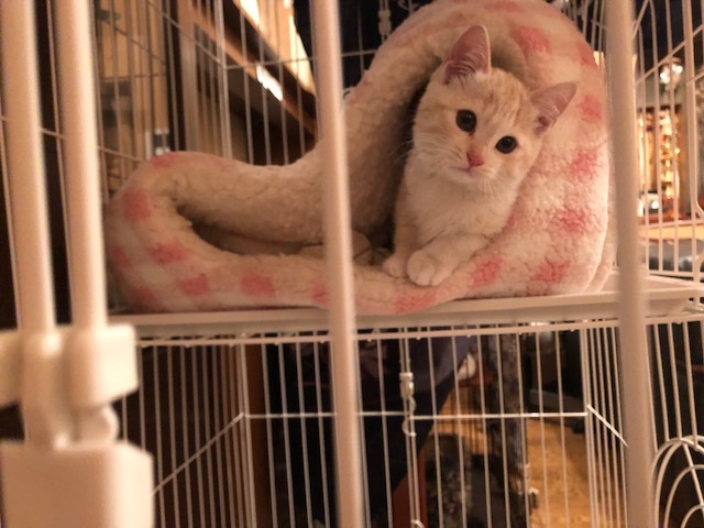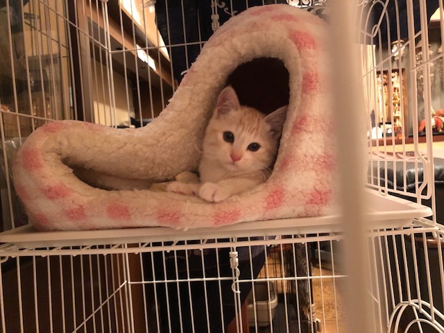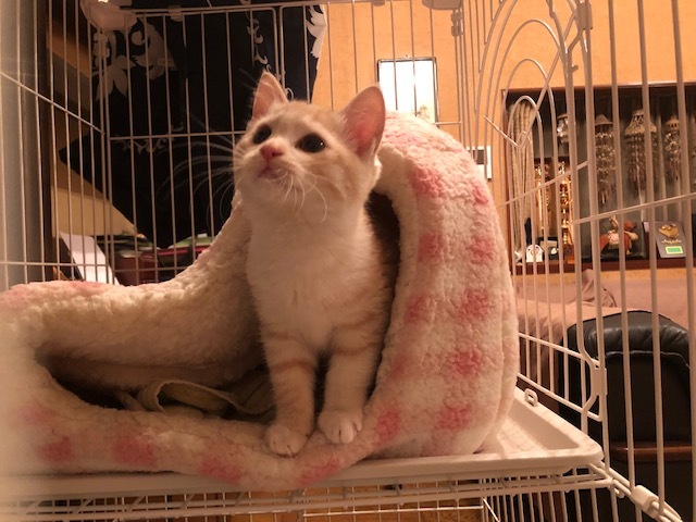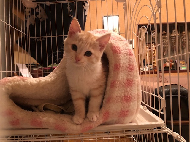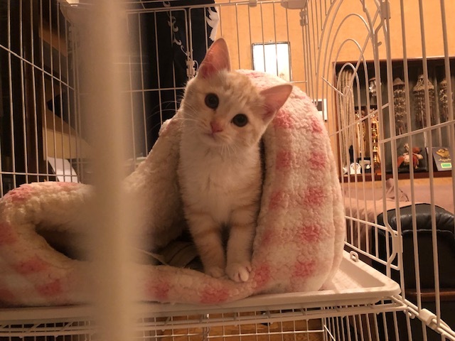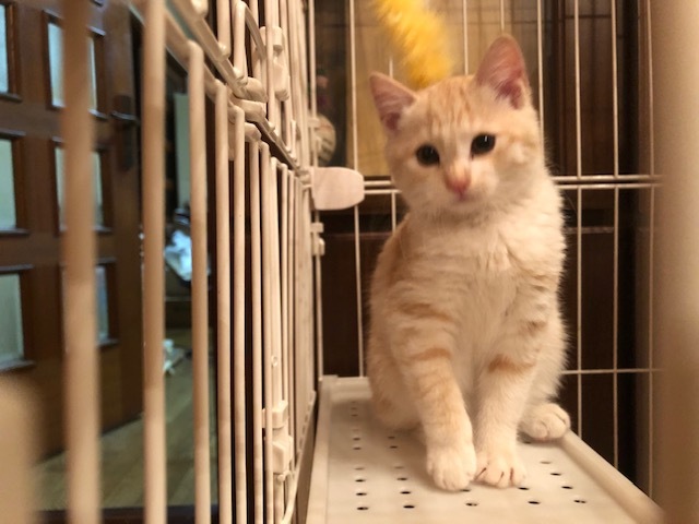 | 特徴(性格など) | 仮名:レイちゃん(茶トラ猫・長尻尾) 初期医療:済み ウイルス検査:陰性 3種混合ワクチン接種:済み 検便・ノミダニ駆除薬:済み 11月8日:1.1kg とても優しい色合いの薄茶トラ仔猫で、兄弟で保護しています。 11月8日に推定1.5ヶ月で保護しました。 健康状態もよく、食欲もありよくフードを食べています。 保護直後から可愛いお顔でシャーと猫パンチしていましたが、 ナデナデ大好きになり、抱っこの練習もしています。 1匹でも可能ですが、兄弟一緒かお留守番の少ないお家を希望します。 |