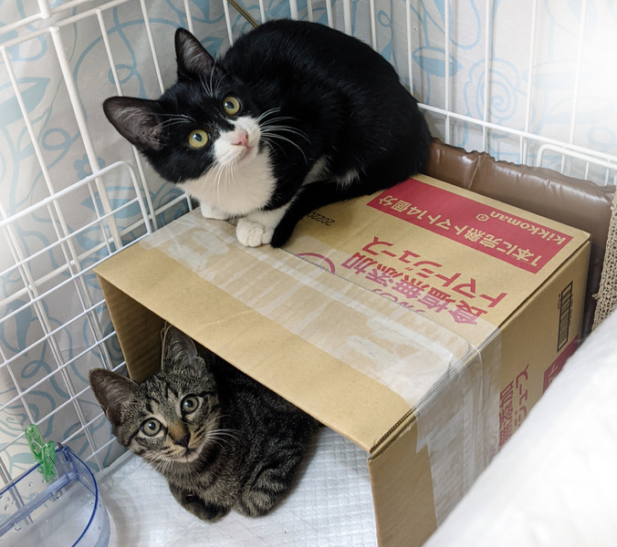 | 里親募集する理由 | TNRの準備中に後ろからカシャッとトラップの扉が閉まる音がしたので、振り向いて中を覗くと、2匹一緒に入っていました。じっと固まって威嚇もしない子たちで、大人しく触らせてくれました。 2匹一緒に大きな幸せを掴んでもらいたいと思い、そのまま保護しました。 同日に捕獲した母猫は、優しい餌やりさんのお家にお迎えいただくことになり、現在預かりさんの元で人馴れ修行中です。 |