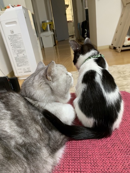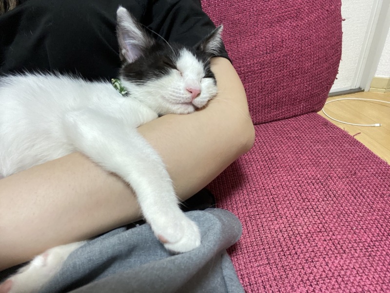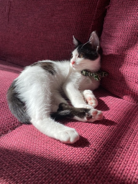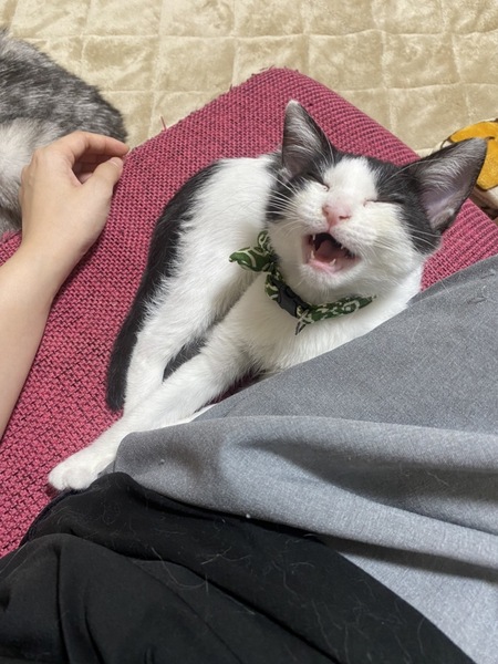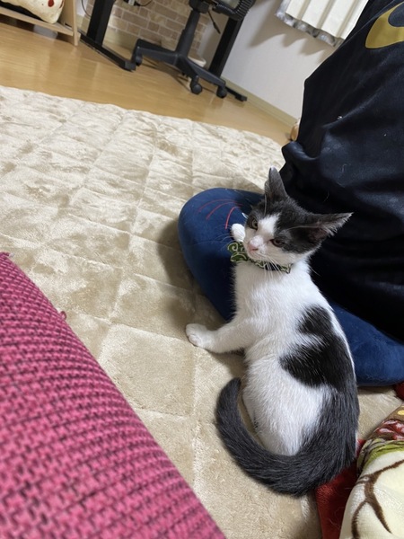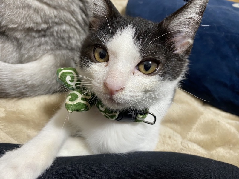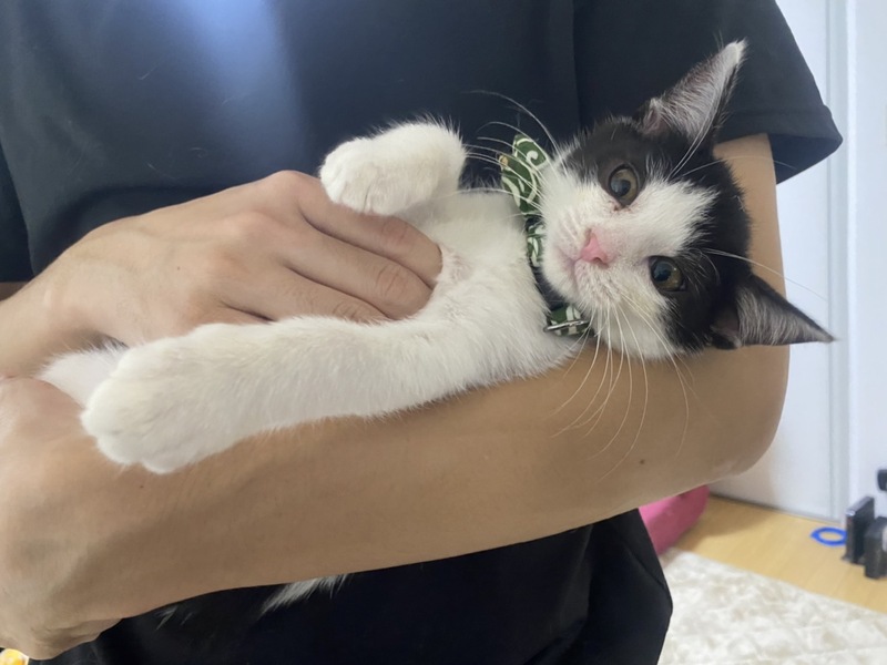 | 特徴(性格など) | 色柄:白黒ハチワレ(背中に2匹黒猫がいるような模様です) 性格:好奇心旺盛で甘えん坊。初対面の猫でも人でも自分から近寄って甘えます。 遊ぶのも大好きです。 |