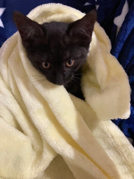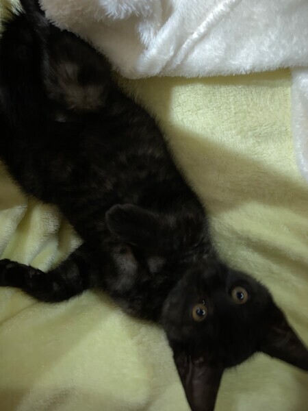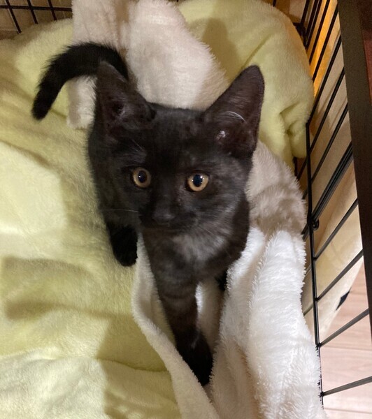 | 特徴(性格など) | 黒の多めのトラ柄です 見た目は 黒猫に見えますが ブラックスモークタビーという 珍しい柄らしいです 保護して間もないのですが とても 人懐っこくて なかなかのヤンチャさんです |