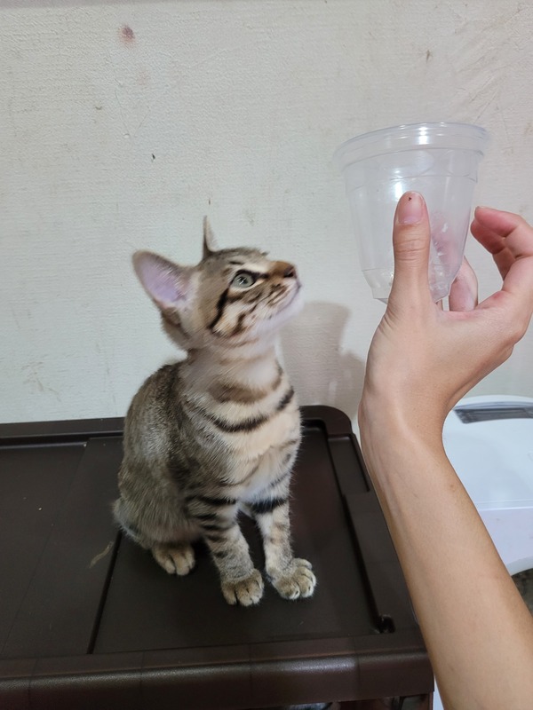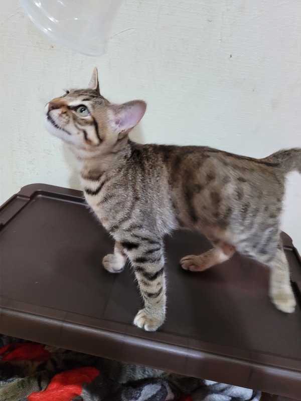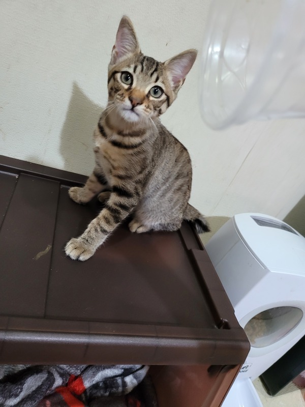 | 特徴(性格など) | 濃いめのキジトラ柄です。 男の子のなかでも一回り大きめで 良く食べて良く寝ます(^^) 人が大好きで起きてるときは 手や足にスリスリしてきて よしよしすると もっともっとっておねだりも上手な子です トイレばっちりです! ごはんはカリカリです おやつは煮干しをあげています! |