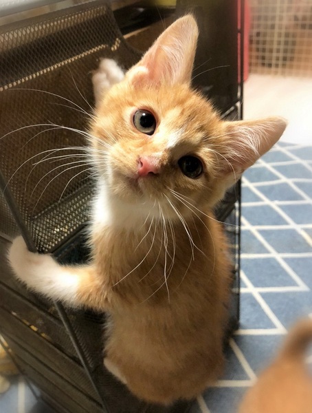 | 特徴(性格など) | まるい顔・まるい目・まるい手足・まるこいパーツで出来上がっている茶シロ男の子 最初、環境に慣れるまで少々怖がりさんです。 かくれんぼのような遊び方にはまっている様子で、ねこじゃらしを振ると椅子や棚に隠れつつ「えぃっ」っと飛び込んで来ます。 気持ちと運動能力がたまにかみ合わない時があり、高い場所に登ったは良いけど・・・「助けて~」と真剣な顔で訴えて来たり 愛嬌のある子です。 |