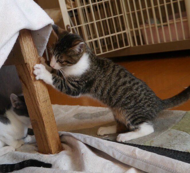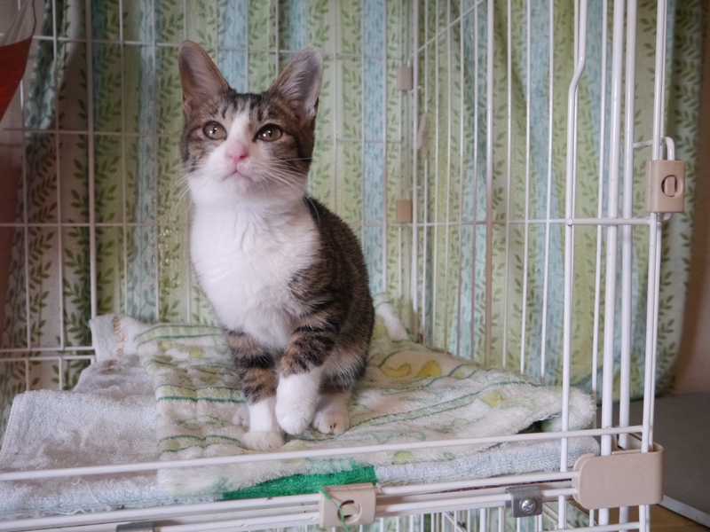 | 特徴(性格など) | ティラノザウルス似のソックス子猫「ティラ」です 白地に背中がキジ模様、足は膝あたりまでがソックスはいてます! 母猫の性格と同じでおっとり系のティラちゃん ちょこちょこ走り、遊んだあとは膝の上に乗ってノンビリと 休んでいます トイレを間違えてお布団の上にする失敗もありましたが 段々と家の中の生活に馴染んで成長しつつあります |