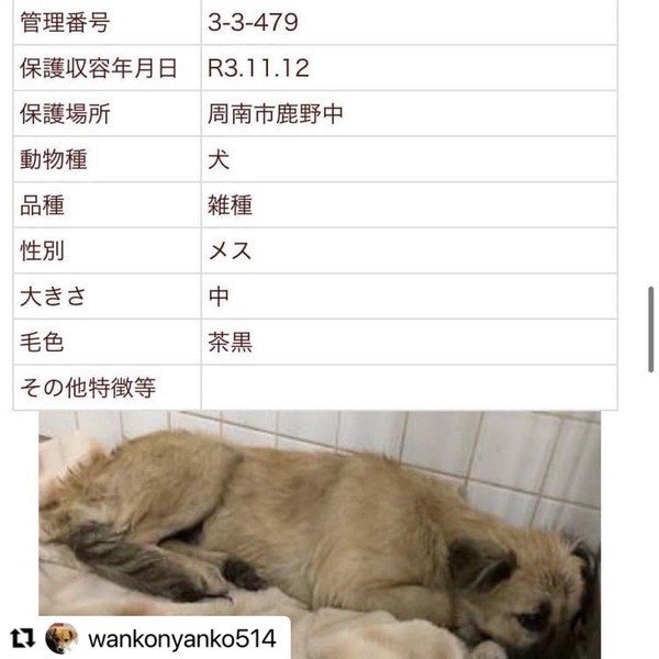 | 里親募集する理由 | 山口県周南健康福祉センターに収容されるのは野犬が多く後を立ちません 収容され1週間の期限がつけられ引き取り手がなければ山口愛護センターへ移動され殺処分になります 生きる権利を人間が奪うのは間違っていると思います とは言え、県の現状は捕獲し期限が来れば殺処分 残念ながら命を生かす考えではないようです ですので、同じ大事な命を里親募集をし家庭犬になってほしいと思っています 野犬はとても賢く意味なく噛んだり威嚇することはほぼありません ただただ人間が怖くビビりさんが多いです 今までもたくさんの野犬が家族に迎えられ時間をかけ愛情たっぷり寄り添い立派な家庭犬になっています 必ず愛情は伝わりこの子だけではなく家族みんながシアワセになります 犬って本来は昔から人間にとって素晴らしい存在です! |