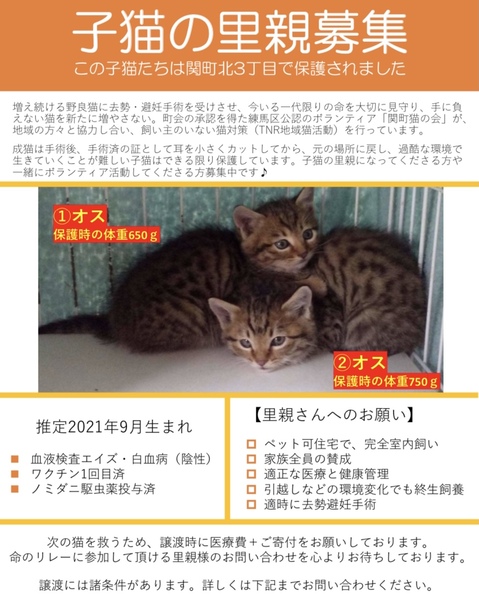 | 里親募集する理由 | 2021年11月3日 練馬区関町北にてTNR地域猫活動中に保護しました。 | ||