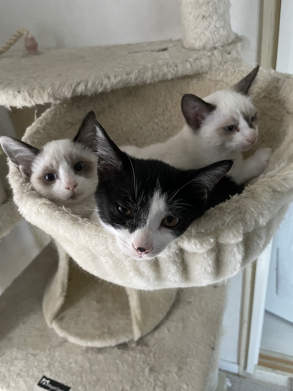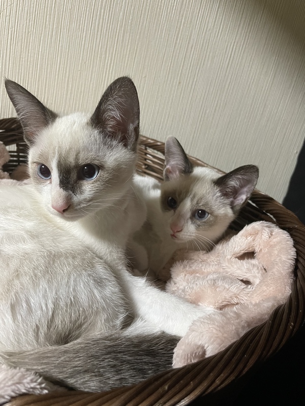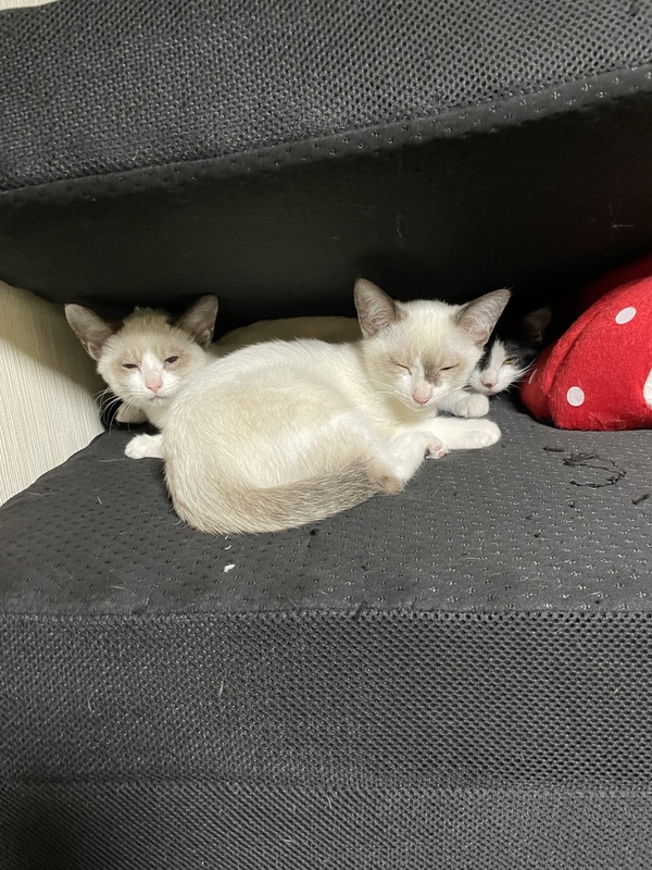 | 特徴(性格など) | 白にグレーの目が青い子が2匹(オスメス) ハチワレの目が黄色い子が1匹(メス) 白い2匹はとても臆病で、慣れるまで時間がかかるかもしれませんが、寝てる時に撫でるとゴロゴロ甘えてきます。 起きてる時は触ろうとすると逃げますが、まだまだ甘えたい時期なので慣れたらとても甘えんぼだと思います。 ハチワレの子はまだ慣れるのが早い方で、2週間程度で甘えてくるようになりました。 |