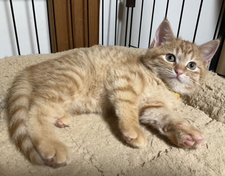 | 特徴(性格など) | 丸いお顔につぶらな瞳、ずんぐりむっくりしたボディが愛らしい、茶トラの男の子です。 被毛は若干長め、見事な茶トラで肉球は綺麗なピンクです。 保護当時 人馴れしていませんでしたが、日々家猫修行に励み、なでなですると喉を鳴らしうっとりするようになりました。 怖がりで初めて会う人や環境には緊張しますが、ゆっくり時間をかけ、ゆずのペースに合わせて関わっていけば必ず馴れます。 兄妹の中で最も慎重で、落ち着いた印象の子ですが、おもちゃなどによく興味を示し目で追っていますので、元来は活発なのかもしれません。 元は人との関わりが全くなく、お外で暮らしていた子ですので、人の急な動きや、知らない人間の出入りは警戒します。 ゆずを怯えさせないよう、充分環境に配慮して下さるご家庭を希望します。 最初は必ずケージから馴らし、信頼関係が築けよく懐くまで ケージから出さないで下さい。 馴れないうちにケージから出してしまうと、家庭内野良となってしまい 人馴れが進まない可能性があります。 母猫を恋しがっているのか、猫が好きで 預かり宅の先住猫を恋しがって追いかけます。 相性もありますが、先住猫がいても問題ないかと思います。 犬のことは怖がって威嚇しますので苦手なようです。 一緒に生まれ育った、兄妹のかりんととても仲良しで、肩を寄せ合って生活していますので、かりんと一緒に迎えて下さるご家庭を希望します。 (1匹のみをご希望の方は応募をご遠慮下さい) 兄妹一緒ならお留守番があっても寂しくないと思います。 ゆずは、育ち盛りで日々目まぐるしく成長しています。 ゆずの人馴れしていく過程や育猫についての悲喜こもごもを、インスタグラムにアップしています。 ゆずの性格や、家猫修行に励む日々の様子が垣間みえますので、是非ご覧下さいませ。 ↓↓↓ http://instagram.com/kemikemi1206 |