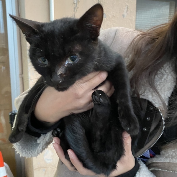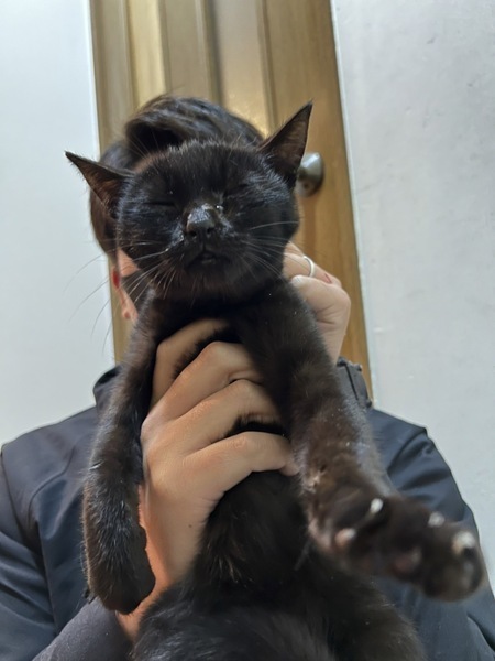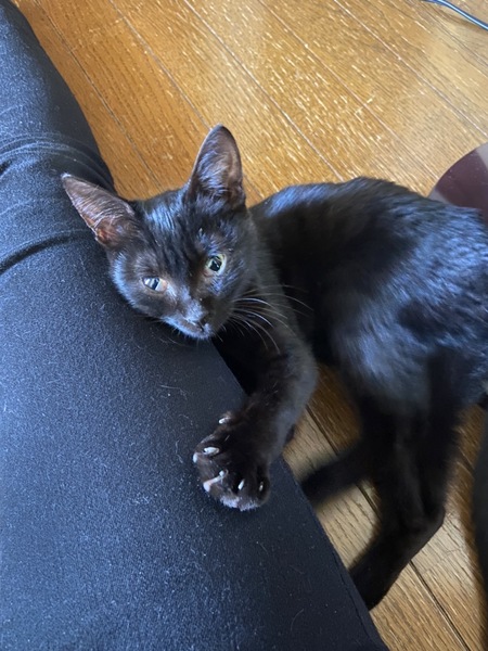 | 特徴(性格など) | 黒猫の仔猫(女の子) 元気いっぱいで人懐っこく、保護された1日目からお腹を出してゴロゴロしています。 |