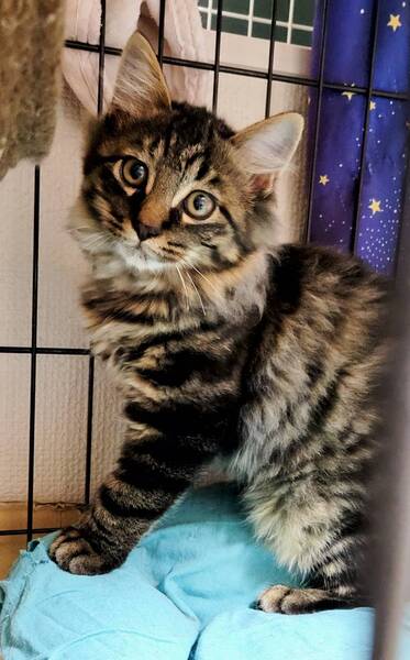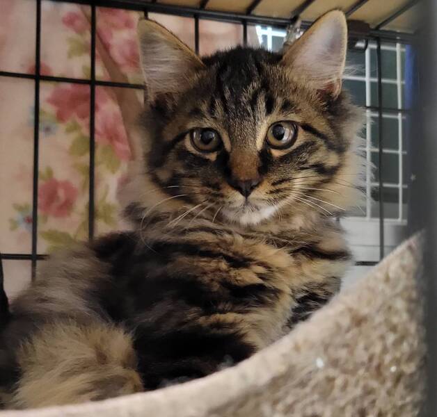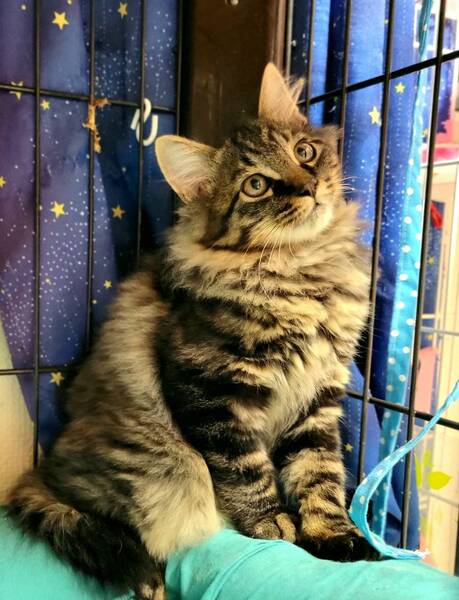 | 特徴(性格など) | モコモコのゴージャスくん♪ 長毛のキジトラ男子で毛量がすごいです♪ 遊ぶの大好き、食べるの大好きな元気っ子です♪ 人馴れ修行中なので猫飼育経験者にお願いします♪ |