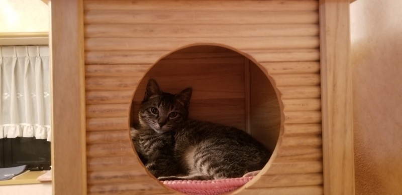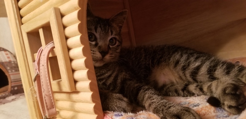 | 特徴(性格など) | キジトラ子猫、人懐こく遊びが大好き、先住猫とも自分からコミュニケーション! 元気いっぱいな甘えんぼうです。 膝の上にのってゴロゴロ~♥眠ってしまいます。初めてのシャンプーや爪切りもお利口さんでした。 |