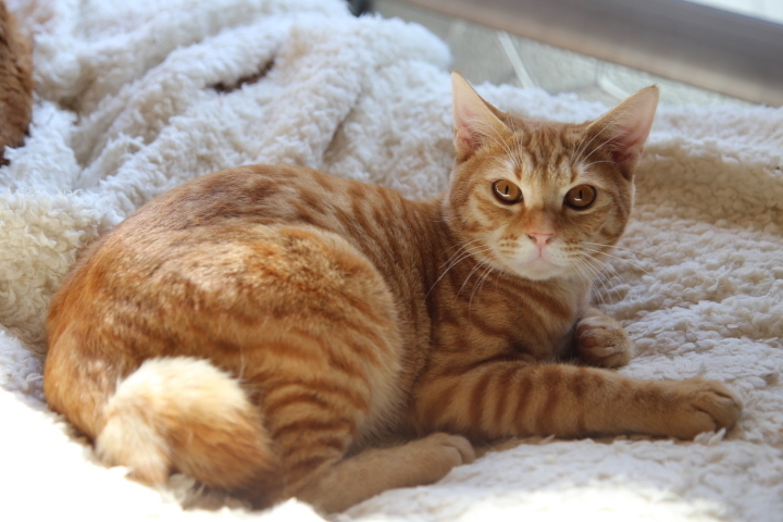 | 特徴(性格など) | クリっとした大きな目と半分に折れ曲がったしっぽが特徴のムールです。 茶トラ男子は甘えん坊と聞きますが、ムールはまだ甘えん坊になる修行中。 お外生活で身についてしまった逃げる癖が抜けないようでとりあえずちょっと逃げようとしますが 安心するとすぐにゴロゴロ言って撫でさせてくれます。 抱っこはまだ身体に力が入ってしまうときがあるので少しずつ慣れさせています。 保護当初に比べると少しずつ人を信用してくれて甘えてくれるようにはなったので これから大人になる過程で甘えることが楽しくなったらザ・茶トラ男子!(甘えん坊)になるのかもしれません。 なるべくムールとの時間がとれるご家庭でこれからの甘えん坊修行を継続していただけるご家族様とのご縁があると嬉しいです。 我が家で募集中の妹のダイヤ、つぶ、あさりと仲良しですので一緒のご縁も大歓迎です! |