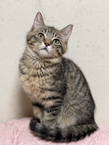 | 特徴(性格など) | 【仮名】成樹くん 【性格】「集☆大☆成」キジトラ3ブラザーズの成樹くん♪ あまりに似ていて見分けがつかなかったので スカイブルーカラーの成樹くんでしたが 見分けがつくようになりました^^; 半長毛とまで行きませんが ちょい毛足が長めで胸毛ふわふわの成樹くん。 お家に来たときは一番の怖がりサンで シャーシャーいってた成樹くんですが ごはんとおやつには一番に食いつき おもちゃにも一番に反応した結果・・・ 一番人馴れが進んでしまいました( ゚Д゚) 要するに た・ん・じゅ・ん!! な成樹くんなのでした(^▽^;) 兄弟や同世代のお友達と運動会を開催していますので 兄弟の大雅くんor同世代にゃんことのお迎えを希望します♪ ※1匹譲渡相談可 |