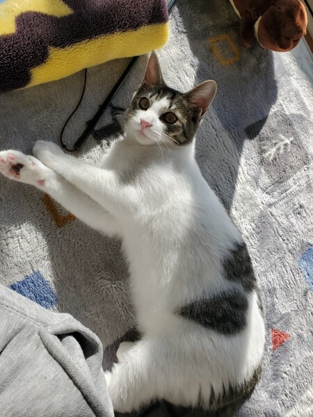 | 特徴(性格など) | 白に黒色の模様があります。小さい頃から飼っているため、人に対して優しいと思います。寝転がっている姿がとても可愛らしいです。 | ||