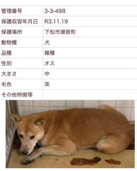 | 特徴(性格など) | 茶色の男の子 野犬なので少し大きめ 収容されたばかりの時は落ち着かず吠えたりしていました 数日経てば落ち着くと思います |