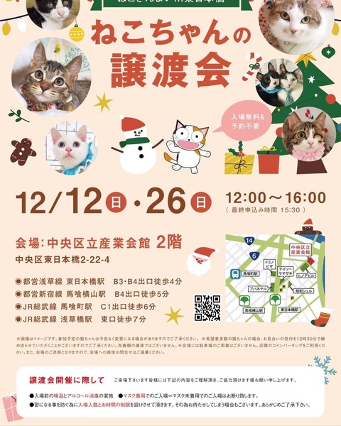 | その他(譲渡条件など) | 11:30より、2階会場入口にて受付を開始します。 受付時に入場予定時間が記入された整理券をお配り致しますので、整理券を受け取った方はお時間になりましたら2階会場入口に番号順にお並び下さい。 ※11:30より早くいらしてもお待ちいただく場所がございません。 また、近隣にお住まいの方や他階フロアのご利用者様にご迷惑となる場合がございますので、受付開始時間にあわせてお越しくださいますよう、何卒ご協力お願いいたします ※ねこざんまい譲渡会は、先着順で里親様を決定する譲渡会ではありません。 先に申し込みをした方を優先することもありません。 お話をして、その猫ちゃんに合ったおうちに決めさせていただいております。 12時に開場し、里親様の決定は14時以降となります。 14時以降にご入場の場合、希望の猫ちゃんが決定している可能性があります。 また1頭に対し多数のご希望をいただいた場合、早めに申し込みを締め切らせていただく場合がございますので、予めご了承下さい。 【新型コロナウィルス感染予防対策について】 譲渡会開催に際し、ご来場下さいます皆様には以下の内容をご理解頂き、ご協力頂けます様お願い申し上げます。 ●入場前の検温とアルコール消毒の実施 ●マスク着用でのご入場=マスク未着用でのご入場はお断り致します ●入場人数の制限をさせていただきます ●時間と人数の制限=密になる事を防ぐ為に入場人数とお時間の制限を設けさせて頂きます その為お待たせしてしまう場合もございます ●会場利用規約により、ご来場者様の連絡先を控えさせていただきます あらかじめご了承下さい 里親様決定は14時以降となります。 その後、迎え入れ準備の説明等のお時間も頂戴しますので、お時間に余裕を持ってご来場下さい。 諸々の制限がございますが、安心・安全な譲渡会運営のためにご理解・ご協力いただきますようお願い申し上げます。 ~~~~~~~~~~~~~~~~~~~~~~~~~~~~~~ ★仔猫ご希望の里親様★ 仔猫ちゃんたちは、まだ体がしっかりしていない赤ちゃんです。 下痢だけでも数時間対応ができなかっただけ死に至る事もあります。 その為、月齢に応じたお留守番時間を設けさせていただいております。 また、子猫ちゃん(6ヶ月未満)の里親様には子猫支援金のご協力をお願い致しております。 ★猫ちゃんとのお見合いは譲渡会で!★ ねこざんまいの猫ちゃんは譲渡会でのお見合いのみとなります。 『この子はいつ譲渡会に参加するの?』『譲渡会場の場所はどこ?』など はねこざんまいホームページをご覧ください。 https://neko3mai.com/ ★楽しく猫ちゃんと触れ合って★ ねこざんまい譲渡会は、猫ちゃんも里親様も保護主も笑顔で過ごせる譲渡会を目指しています。 これから20年以上、楽しい時も、悲しい時もいつも傍にいてくれる大切な家族になる猫ちゃんです。 会場には沢山の猫ちゃんがいます。 1匹1匹、触れ合って猫ちゃんとお話ししてください。 『初めて猫ちゃんを家族に迎える方』 『先住猫ちゃんのお友達を迎える方』など トライアルの仕方や先住猫ちゃんと仲良くなるコツなど経験豊富な保護主やスタッフにお気軽にご相談ください! 猫を愛し、そして猫に愛されている猫好きスタッフと保護主がアドバイスさせていただきます。 ★里親希望のみなさまへ★ ペットではなく、家族一員としてたっぷり愛情を注いでくださるご家庭をお待ちしております。 恐れ入りますが、 ・学生の方 ・一人暮らし、同棲中の方 ・子猫、若猫希望の60歳以上のみのご家庭 ・脱走防止対策にご協力いただけない方 は原則譲渡を遠慮させていただいております。 ただし、預かりボランティアさんとして新しい家族が決まるまでの間、猫ちゃんを預かっていただく道もございます。 参加猫ちゃんは、それぞれ保護主(実際に猫ちゃんを自宅に入れ、保護をしている方)が異なります。 詳しい条件なども異なる場合がございますので、会場内で直接保護主とお話ください。 〖共通条件〗 1.終生飼育 2.完全室内飼い 3.脱走防止対策へのご協力 4.避妊去勢手術 5.契約書類へのサイン 6.定期報告 7.医療費等の負担 当日の猫ちゃんを連れて帰ることはできません。後日、保護主が里親様のご自宅までお届け致します。 その為、移動の際の猫ちゃんの負担を月齢などから考慮し、お届け地区を限定させて頂くこともございますのでご了承ください。 ご理解とご協力のほど宜しくお願い致します。 ☆よくある質問☆ ・譲渡の条件 ・ご負担頂く費用 ・譲渡会の場所等は ホームページに詳しく掲載させて頂いておりますのでご覧ください。 https://neko3mai.com/ メールでのお問い合わせはすぐにご返答出来ない場合がございますのでご了承ください。 ホームページ https://neko3mai.com/ お問い合わせ http://www.neko3mai.com/contact/form_general.html ねこざんまいブログ http://ameblo.jp/neko3mai/ |