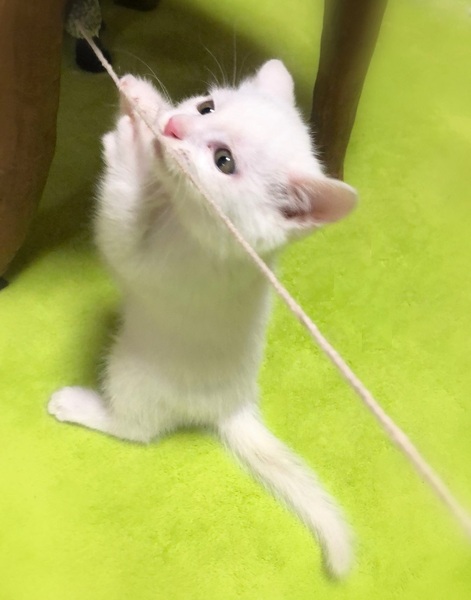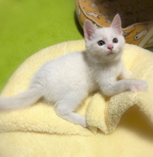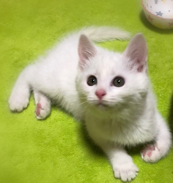 | 特徴(性格など) | まるい顔に丸いお腹・頭のてっぺんにちょろっと黒い差し色が入った女の子 人が大好きで、いつでもゴロゴロの人懐こい性格 走ったりおもちゃを追いかけたり遊ぶの大好きです。 |