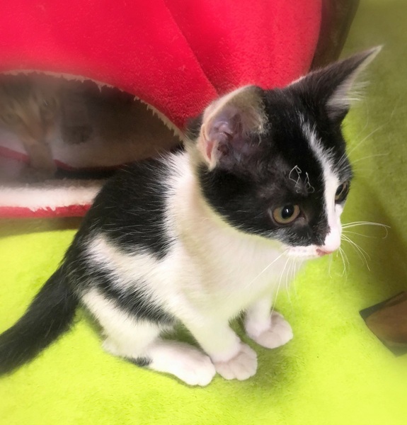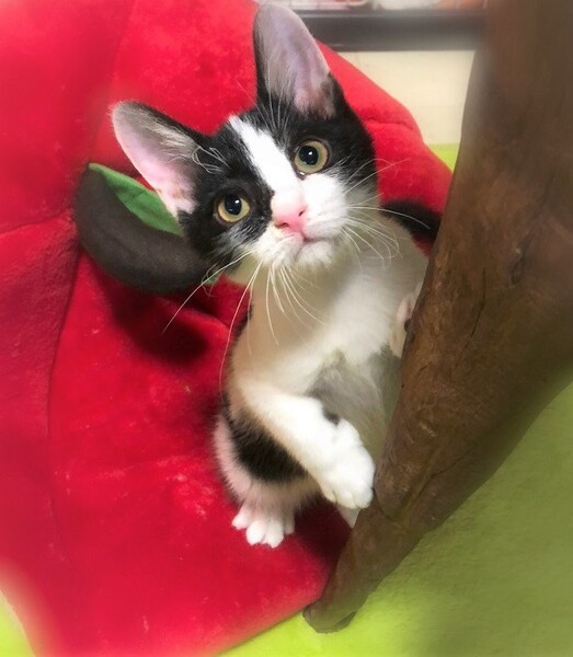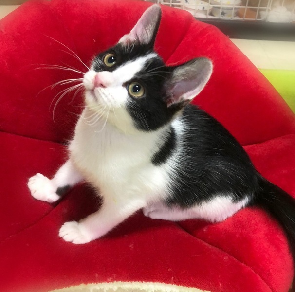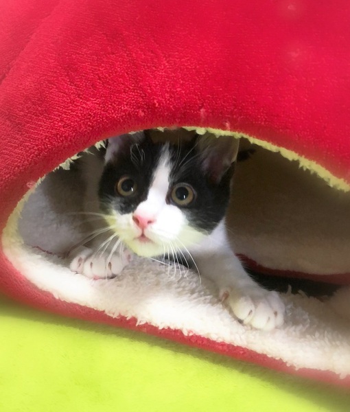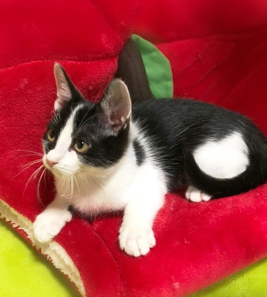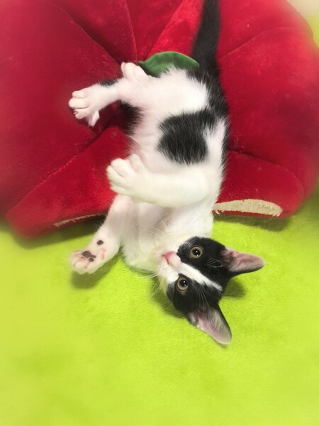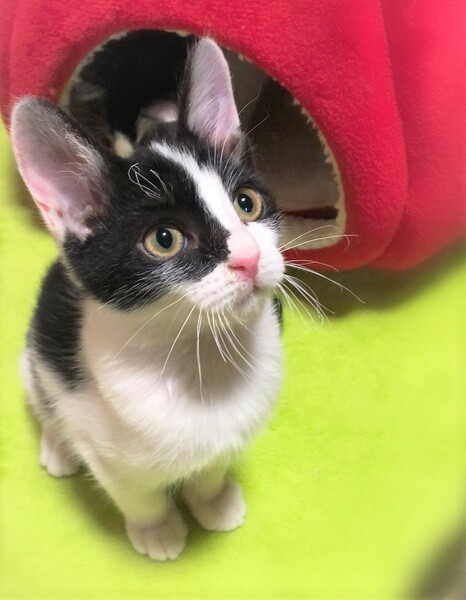| 特徴(性格など) | 斜めハチワレ白黒男の子 好奇心旺盛で、何にでもわくわく顔・一生懸命遊んで一生懸命に甘えます。 目が合うとゴロゴロ・走っている時にひょいと抱っこしてもゴロゴロ・眠る時もゴロゴロ~人が大好きです。 |