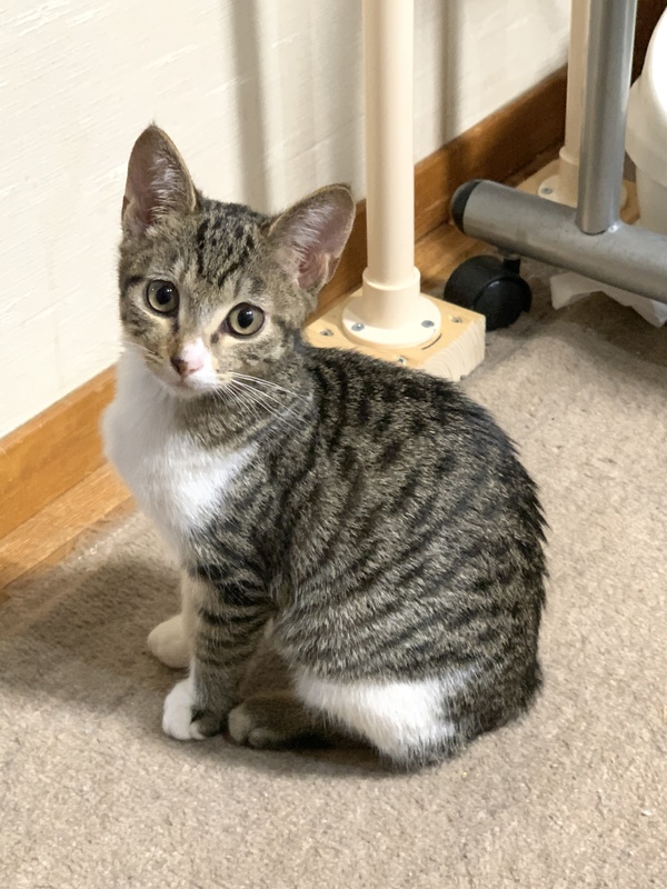 | 特徴(性格など) | 兄弟猫の中でも1番小柄な女の子です。 とても大人しい子ですが、人馴れはしています。 他の兄弟猫に比べて、毛の色が若干茶色味がかっています。 卒乳し、今のメイン食事はカリカリフードです。缶詰やちゅ〜る等も大好きです! |