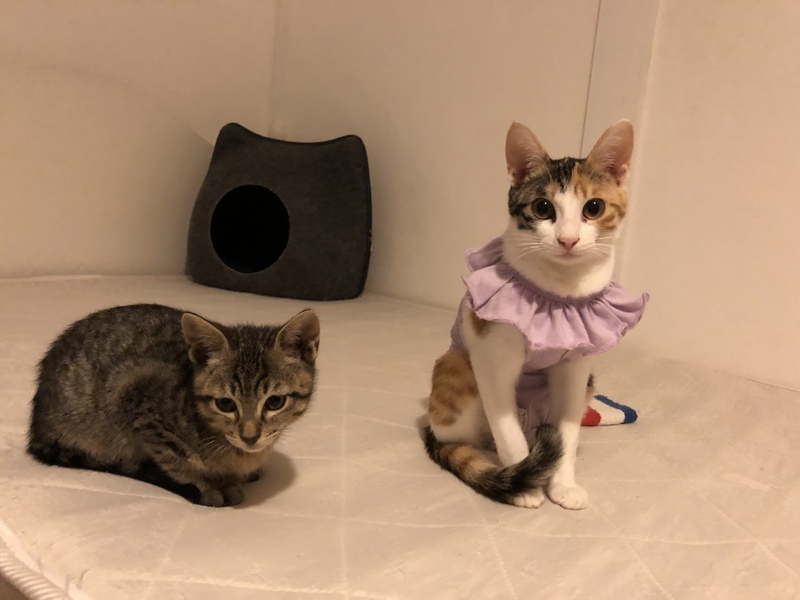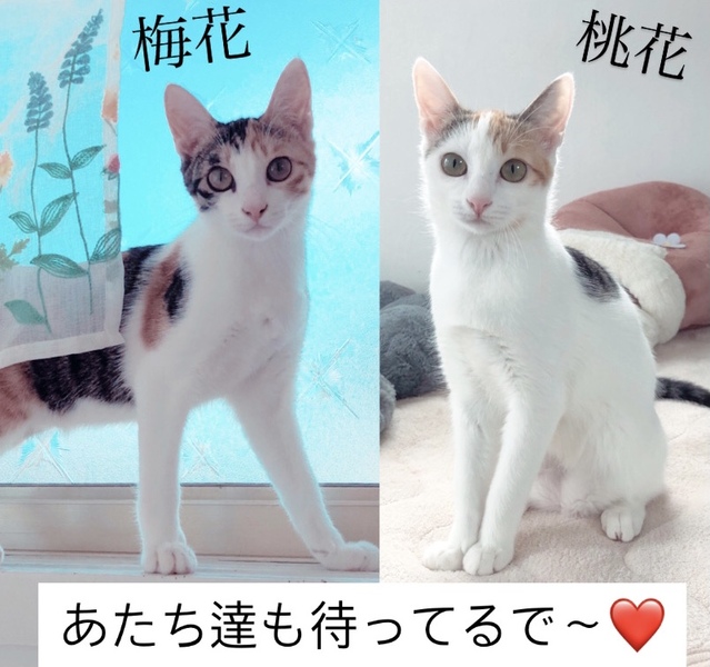 | 特徴(性格など) | 三毛多めの梅花ちゃん、臆病ですが最近、人が好きになりました♡近くに寄って小さな声で鳴いてくれます♡遊ぶのも大好きです♡ 白が多めの桃花ちゃん♡怖がりですが、物おじしなくなってきました♡人のそばで寄り添ってくれるタイプになりそうです⁽⁽ଘ( ˊᵕˋ )ଓ⁾⁾ |