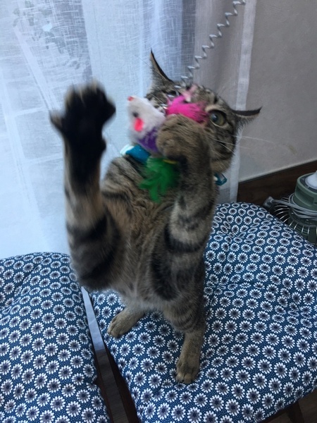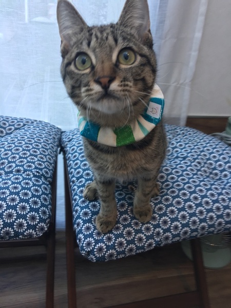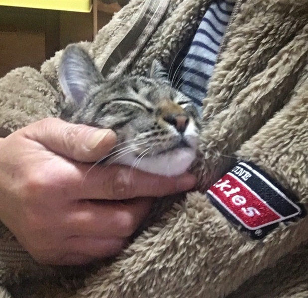 | 特徴(性格など) | 目が開いた頃に保護され人がミルクで育ててるので、初めての人にも直ぐに甘えてゴロゴロ喉を鳴らしてフミフミを始めます。 ボアの服を着ていたらチュウチュウとフミフミが止まらず。初心者でも飼いやすい猫です。尻尾は真っ直ぐでキジです。 ノミダニ駆虫済み ワクチン2回済み ウィルス検査済み、陰性 去勢済み |