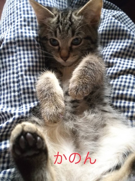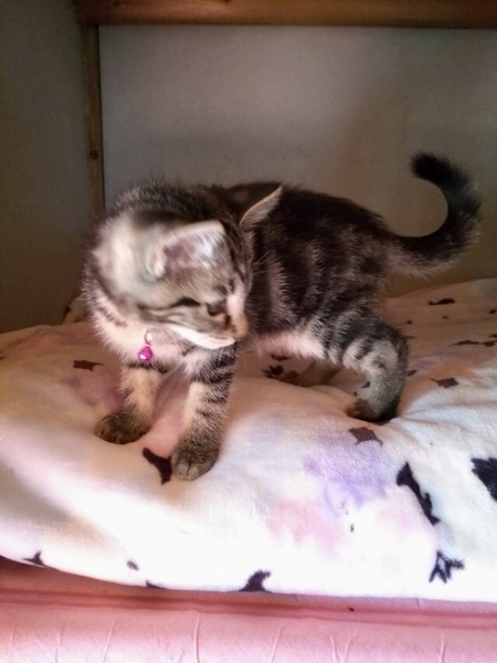 | 特徴(性格など) | キジですがアメショーの様な渦巻があります。姉妹の明日香ちゃんはキジです。毎日空中戦をして仲良く遊んでいます。出来れば2匹一緒を希望します。 ノミダニ駆虫済み、ワクチン1回済み 2ヶ月半くらい |