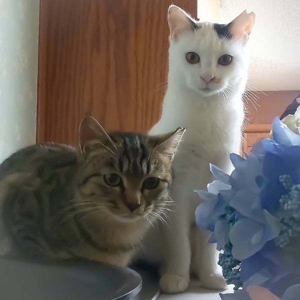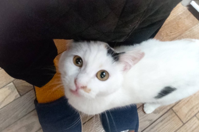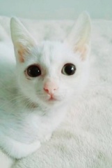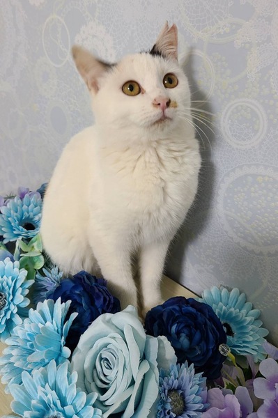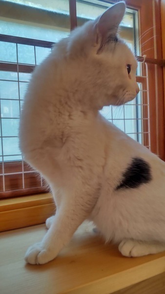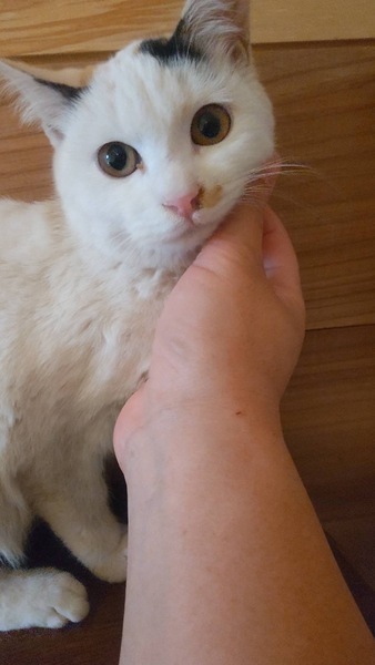 | 特徴(性格など) | 身体は白、頭のてっぺんなど一部分が三毛です。 痩せていますが健康です。 獣医師の健康診断済み。 ノミダニお腹の虫駆除済み。 同時に募集しているファリン、シュファと家族で仲良しです。 のんびりした性格のようで抱っこ大好きです。 避妊手術済み、耳カット有り。 |