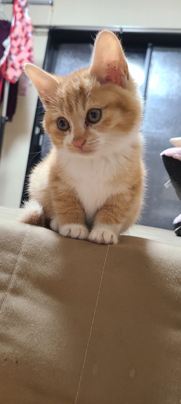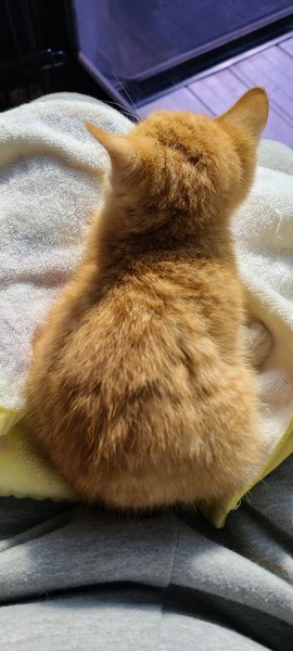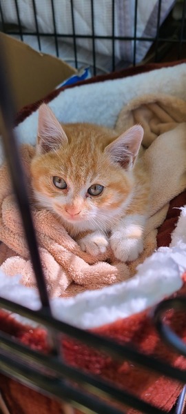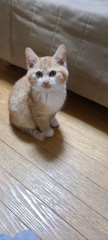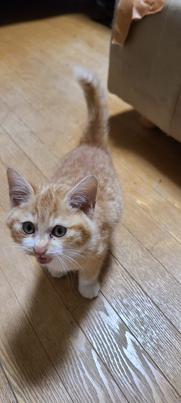 | 特徴(性格など) | 11/25車のボンネットの中に入り込んでいたところを保護しました。 保護当時はとても大人しく、 シャーと威嚇はするけど 噛み付いたり爪たてることも一度も ありませんでした。 ご飯もしっかり食べます。 トイレも粗相することなく、うんちもおしっこも紙砂の上にしています。 保護の翌日、人に慣れてもらうのに膝の上に乗せるとゴロゴロいいながら乗っていました。 ただまだ警戒してる用で逃げてしまうと狭いところに入ってしまいました。 保護して3日目くらいに猫じゃらしを投入! 戸惑っていましたがすぐ遊びはじめました。 いつもゴロゴロ言っています。 11/29病院行きました。 650g女の子。 白血病の検査と猫エイズの検査をして、結果は陰性でした。 まだ免疫がついていないので心配ならあと数ヶ月置いてまたやってもいいとの事でした。 ワクチンもまだちょっと小さいので打っていません。 耳はきれいで からだにノミがいたのでブロードラインをたらしてもらいました。 目やにも少しあったので点眼薬を処方されるはずでしたが抜けてしまい、翌日にもらいにいって現在点眼しています。 今ではシャーと言う事もなく、ソファーに登ったり、猫じゃらしで遊んだりとすっかり猫!って感じになりました。 |