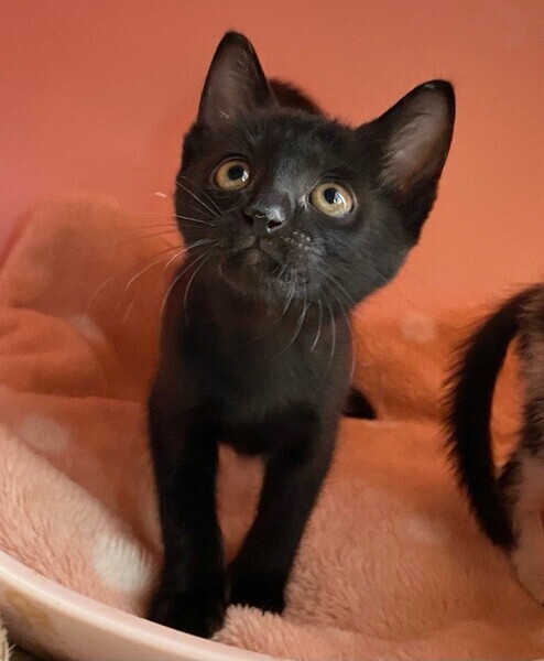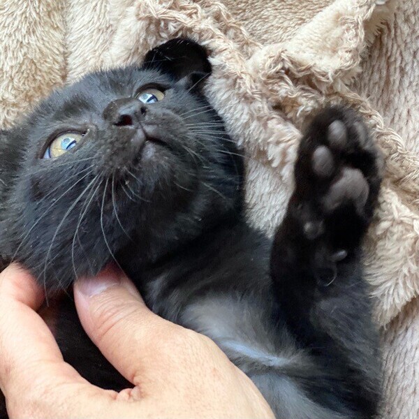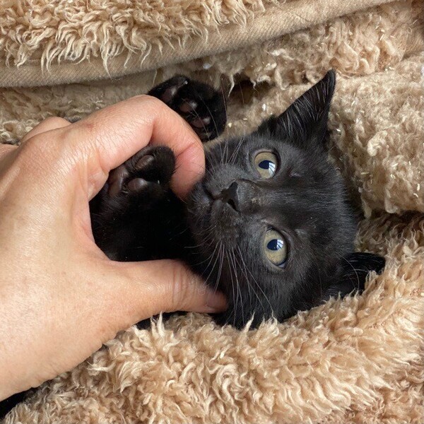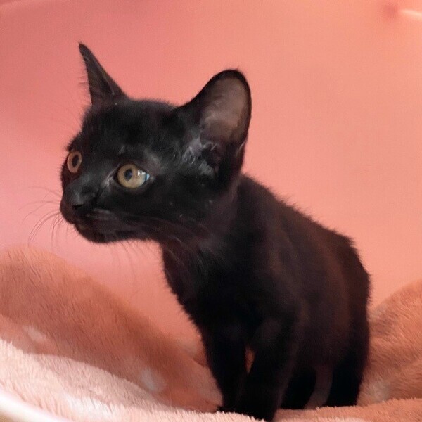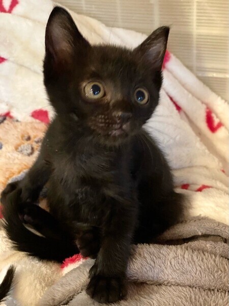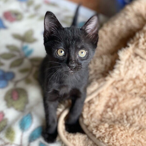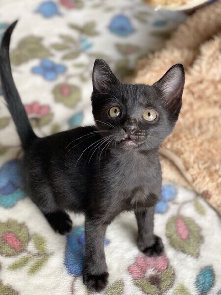 | 特徴(性格など) | 陽気な黒猫「シリウス」ちゃん❤ 人が大好き♪いつも元気にお友だちと駆けっこ♪と思うと、隅っこに潜って爆睡Z 現在、ドライフードを24時間の置き餌として栄養補給、水分補給のため一日4回パウチを与えています。 <推定誕生日:9月中頃> |