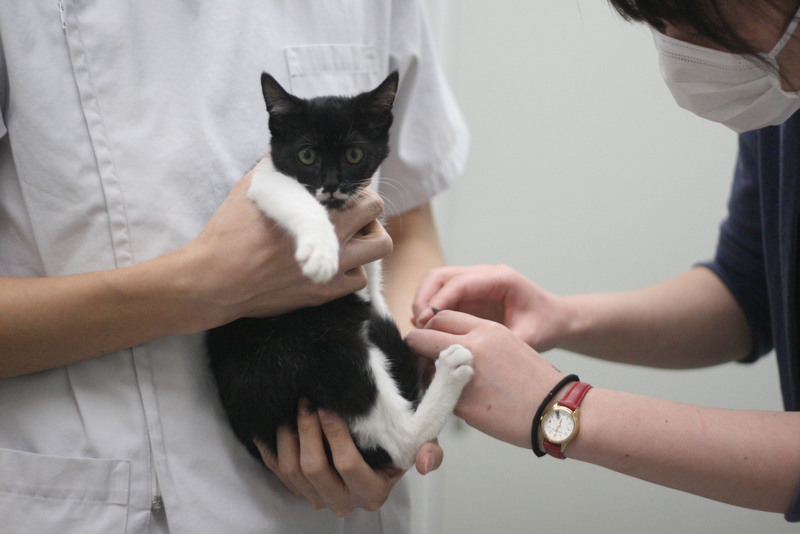 | 特徴(性格など) | 白黒♀長い尾っぽ 大人猫にシャーフーされても、大人しくしている良い子です 先生や看護師さんに抱っこをして貰ったり、爪切りをして貰ったり、シャンプーしてもらったり、遊んでもらったりしています。 |
