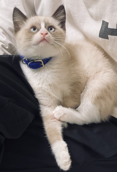 | 特徴(性格など) | 全体的にはクリーム色、耳や目の周りは茶色いです!瞳が青色。 まだ小さいので、とっても甘えたがりで人懐っこいです! ベッドにいると布団に潜り込んで、甘えてきます! |
