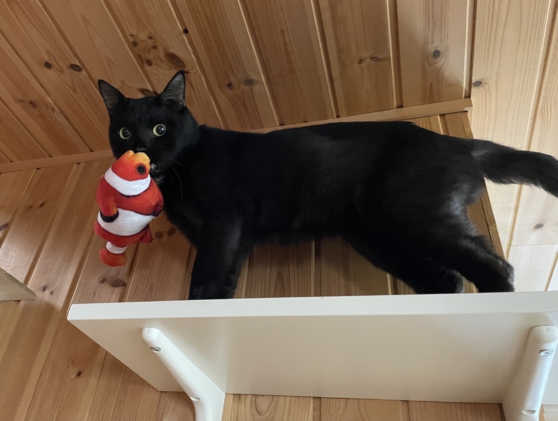 | 特徴(性格など) | 黒毛ですが、ほんの僅か(数十本レベル)に白毛混じりです。 尾尻は長く、先の方に曲がりが少しあります。 小柄で好奇心旺盛、身体能力抜群、走り回って遊びます。投げたオモチャは、走って取りに行き、口にくわえて戻ってきてくれます。 見た目クールな感じですが、ゴロゴロスリスリのとても甘えん坊。ブラッシング大好き。 抱っこはもちろん、膝にもどこにでも乗ってきてくれます。 爪切りも大丈夫です♪ 外生活からの保護でしたが、夜間、ゲージ内にておとなしく寝る習慣もできてます。 獣医さんによると、口内の状態などから推定6〜7歳くらいとのご判断でした。 フードはドライフードを食べてます。錠剤のお薬もカリカリと一緒に食べてくれます。 とても人懐こい為、元は飼猫だったのではと思われます。(保健所、センターに探し猫の問い合わせ済。飼い主がいない事を確認しました) |