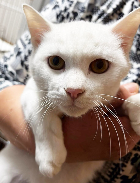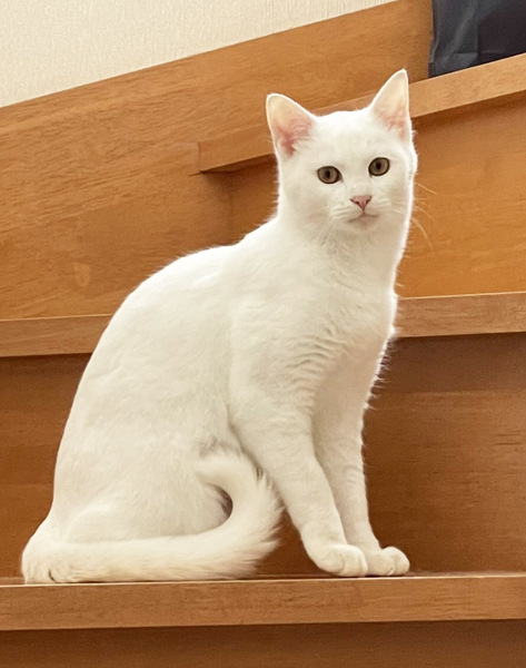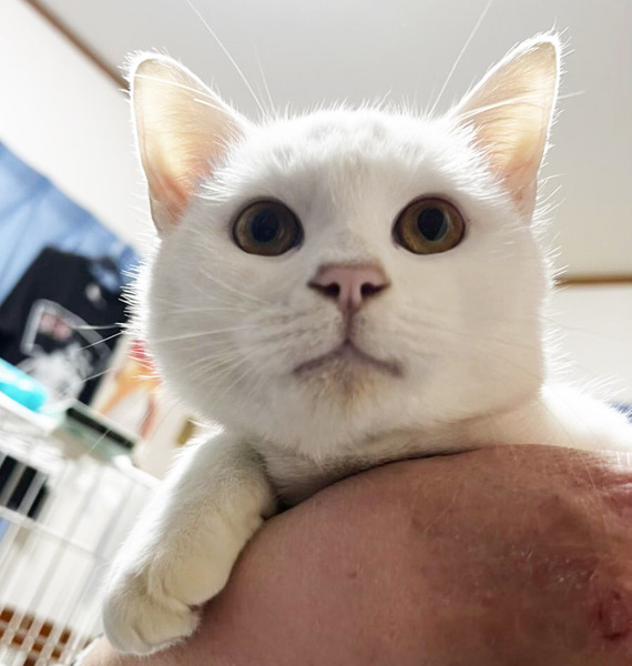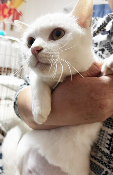 | 特徴(性格など) | 白猫で金色の目をしている生後約7か月の男の子です。 金色の瞳で白猫は縁起がいいと、知り合いの方に言われました。 とても人懐こく、よく甘えてきます。 賢い可愛い猫です。 11月初めに保護して、すぐに動物病院で診てもらいました。 当時、下痢してたため、血液検査で数値が高い項目もありましたが、 治療していただき、今ではすっかり良くなり、 食欲も旺盛で元気です。 男の子だったので、動物病院で、11月20日に去勢手術もしていただきました。 |