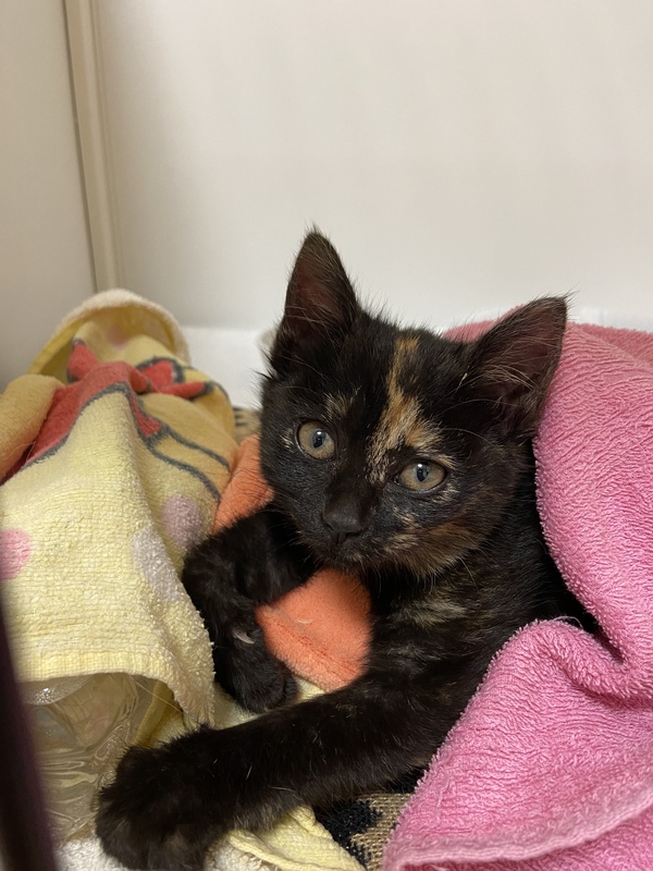 | 特徴(性格など) | サビ猫の女の子です。 体重は750gで推定年齢は1ヶ月半です。 12/6の朝学校の前で保護しました。 とても人懐っこく登校中の学生にずっと着いてきたそうです。 撫でると喉を鳴らして舐めてきます。 |