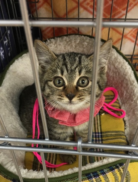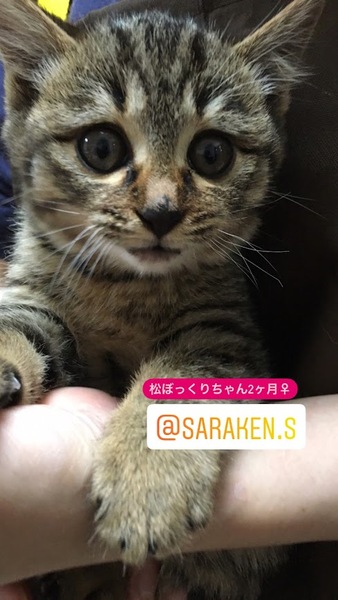 | 特徴(性格など) | 全身のキジ模様がはっきりしていて松ぼっくりみたいな女の子。 人懐っこく愛らしい仕草の子です。 ノミダニ駆除、駆虫、血液検査済み。 エイズと白血病は陰性です。 ワクチンはまだ小さいのでまだです。 週末12日(日)の防府市スマイルほうふでの譲渡会に参加予定です。 |