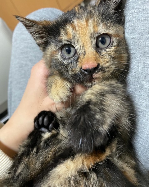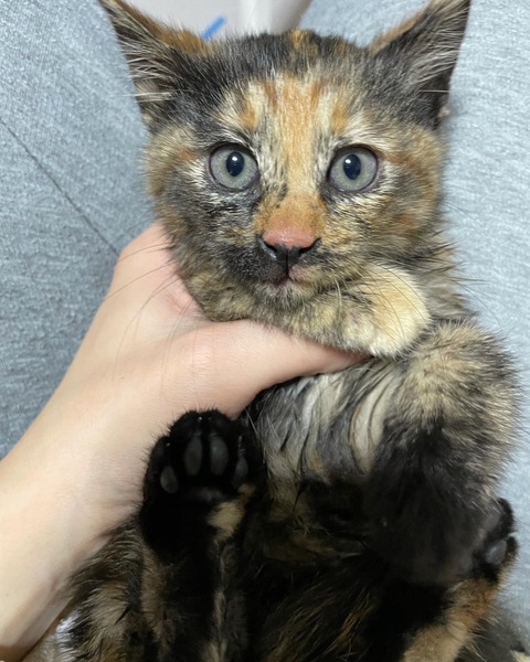 | 里親募集する理由 | 朝方うちの前の川の下で上に登れず鳴いていて母猫を探した所は近くにいず、、このままでは危ないので保護しました。病院で診ていただいたところ健康状態は良く、元気な女の子でした。生後1か月半くらいだそうです。 |