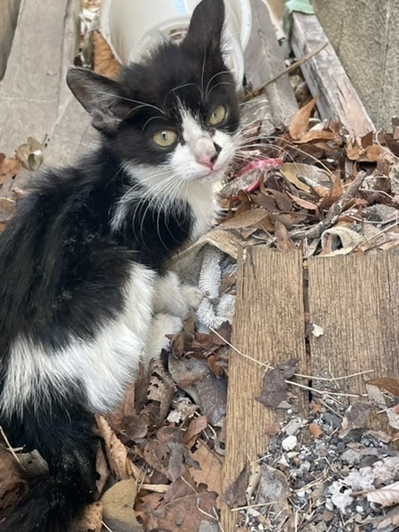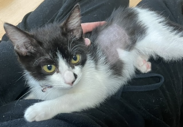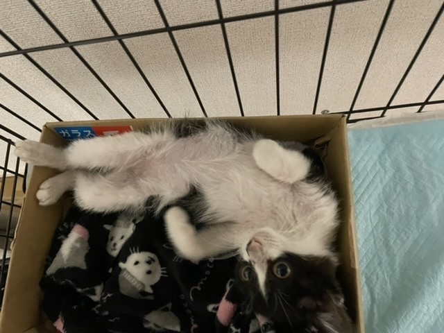 | 特徴(性格など) | ハチワレの白黒猫です。鼻の左側に小さいブチが有ります。 保護する時は素手で捕まえる事が出来ました。嫌がりましたが、噛んだり引っ掻いたりはしなかったので大人しい性格だと思います。抱っこをするとそのままくつろぎます。 保護時体重600gでしたが、お腹が減っていたのか一晩でカリカリを60g食べました。ちゅーるやウェットフードも大好きなようです。 教えなくても用意したトイレを使いました。くねくねしますが爪を切らせてくれます。 |