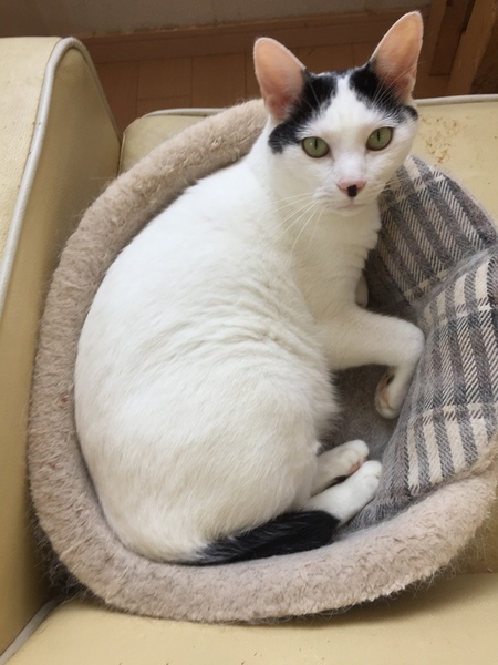 | 特徴(性格など) | 柄は白いふわふわに、髪の毛のような可愛らしい黒い斑点です。 性格はとても穏やかで優しいです。とても甘えんぼで膝の上に乗ってきます。 噛んだり、爪を立てることはありません。 |