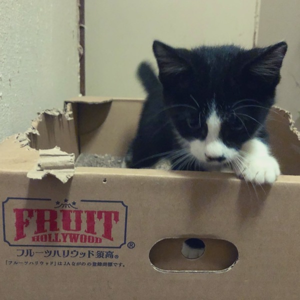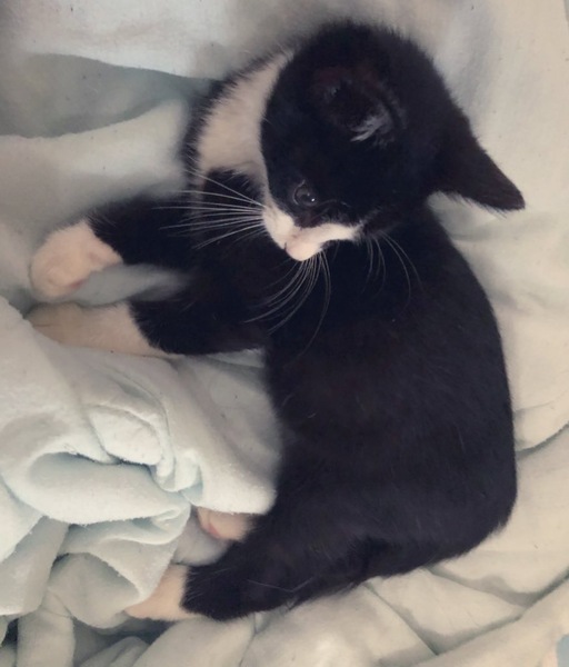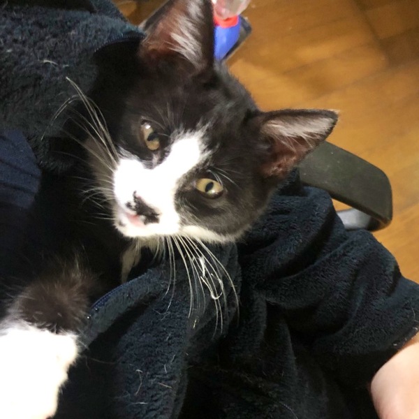 | 特徴(性格など) | 白黒ハチワレ+おひげ模様、足が全て靴下さん、長めのかぎしっぽの男の子です。 とてもやんちゃで元気がよく、人の事が大好きでだっこするとゴロゴロ甘えます。 洋服の中や布団に入るのも大好きです。 |