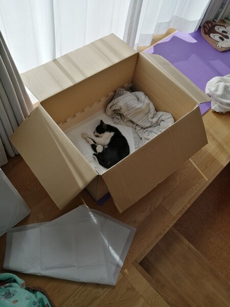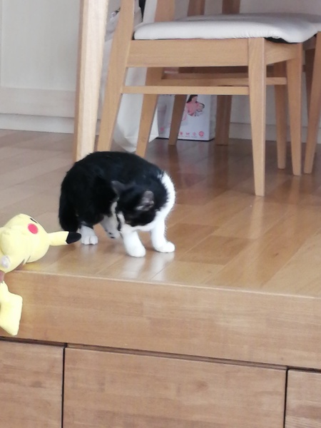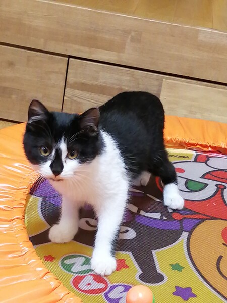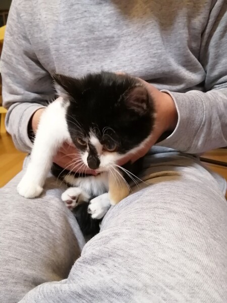| 特徴(性格など) | 白黒のハチワレです。 鼻先が黒かったり、手は靴下を履いているみたいだったり、かわいい模様をしています。 まだ威嚇はするものの、おもちゃで遊んだり撫でさせてくれたりします。 桶でお風呂に入れたりドライヤーもしましたが、威嚇はするけど大人しくさせてくれました。 現在はリビングにもよくでてくるようになり、撫でてゴロゴロ言うようになりました。 |