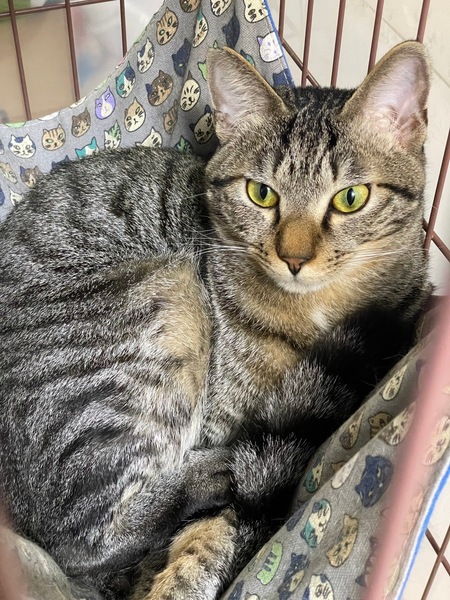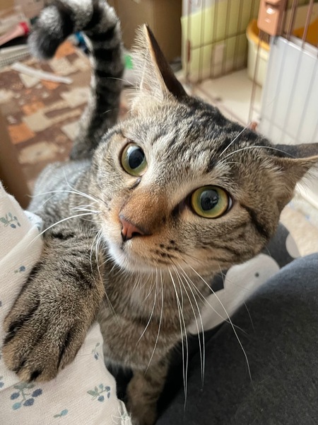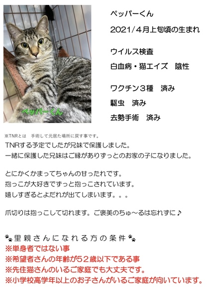 | 特徴(性格など) | 仮名「ペッパーくん」ワクチン済み、駆虫済み、ウイルス検査白血病、エイズ共に陰性 キジの男の子 とにかくかまってちゃんの甘えん坊です。 抱っこして爪切りもできます。 お名前を呼ぶと走って来る賢い子です。 小学生以上のお子さんがいるご家庭が向いていると思います。 |