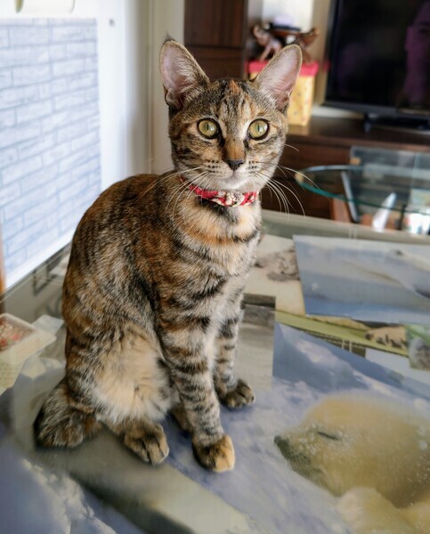 | 特徴(性格など) | 授乳から姉妹揃って育てていますので、人間に全く警戒心はなく、常に人に甘えたがる子ですし、拙宅には成猫がいるため猫にも懐いています。 可愛い声で鳴きながら抱きついてくるたいへんな甘えん坊さんの三毛キジ柄の女の子です。 |